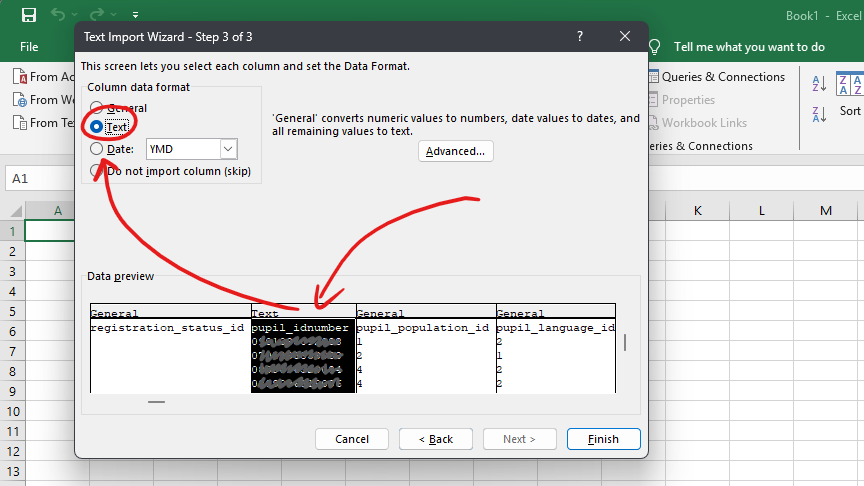 Find fields, such as ID Number and phone number fields, click on the header to highlight the field, and then change the “Column data format” to “Text”. This will prevent Excel from changing these to numbers and dropping any leading zeros.