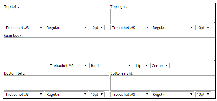 The top left and top right appear as such on the label, as to the bottom left and bottom right. The main body will appear vertically centred in the label, but the horizontal alignment can be specified.