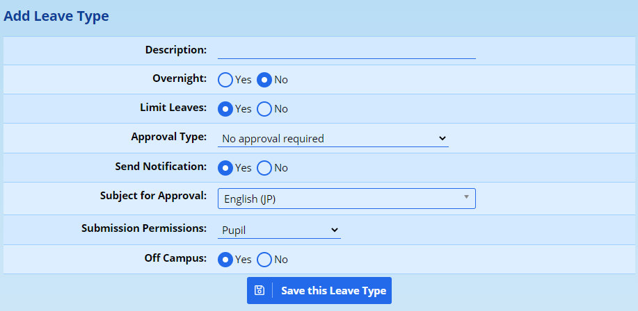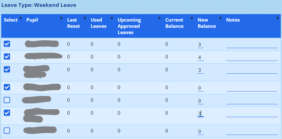 Note that if leave limits are not set for each pupil and for each leave type this will result in parents, staff and pupils being unable to apply for leaves of types where no limit has been set. In the same way pupils who have a balance of zero leaves for a particular type will not be allowed to request leaves of that type.