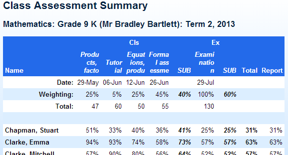 The assessments here are split up into their assessment categories – in this case “Classwork” and “Examinations”. Each assessment is weighted to contribute towards its category total and then the category totals are weighted to come up with a term result.