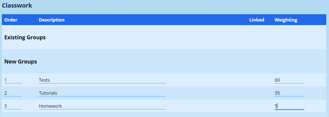 Note that none of the totals need to add up to 100. ADAM will calculate the proportions correctly based on the total number of marks that it has to work with. In the very arbitrary example below, the Classwork assessments are weighted out of a total of 10 (1 + 2 + 7 = 10). Note how these are converted automatically to percentages (1 out of 10 is 10%, etc.):