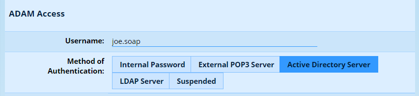 Once set, this can be changed individually for pupils in the database. This could allow, for example, senior pupils to use Active Directory passwords and junior pupils to use internal ADAM-managed passwords. It is also possible to change a pupil’s authentication mechanism to prevent them from logging in at all.