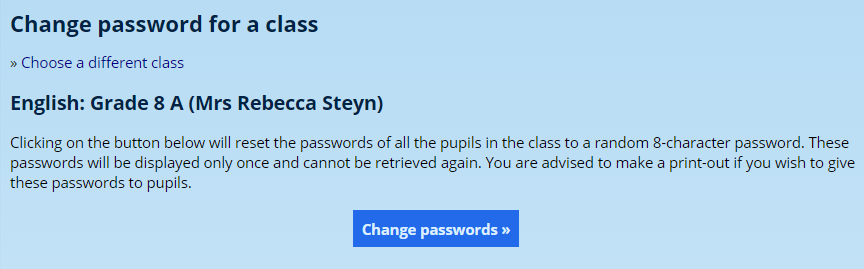 ADAM can also set a class’s passwords to a random password by navigating to Pupils → Security → Change a class’s passwords. Here, ADAM will prompt you to click on a button:
