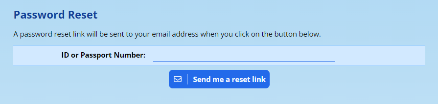 Enter your ID number or Passport number and click on the Send me a reset link.