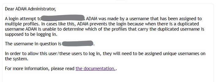 Similarly, when parents attempt to change their passwords and provide a duplicated ID number, ADAM will not be able to determine which profile should have its password change. In this instance, no email is sent to the parent and they will not be able to change their password. However, as with the login attempts above, the ADAM Administrator will receive an email notification that the duplicated ID number exists on the system.