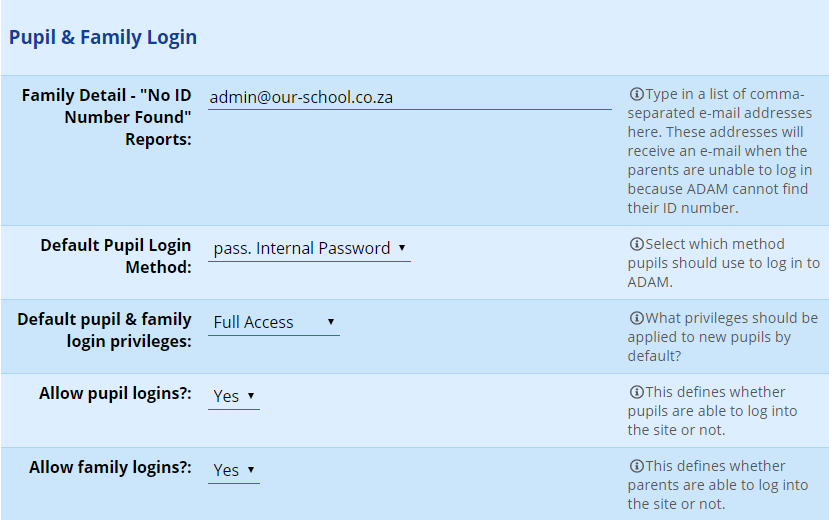Allow Family/Pupil Logins: Change these settings to “Yes” as required.