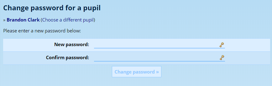 If a pupil has an internal password and it needs to be changed, this can be done by a staff member by navigating to Pupils → Security → Change a pupil’s password.