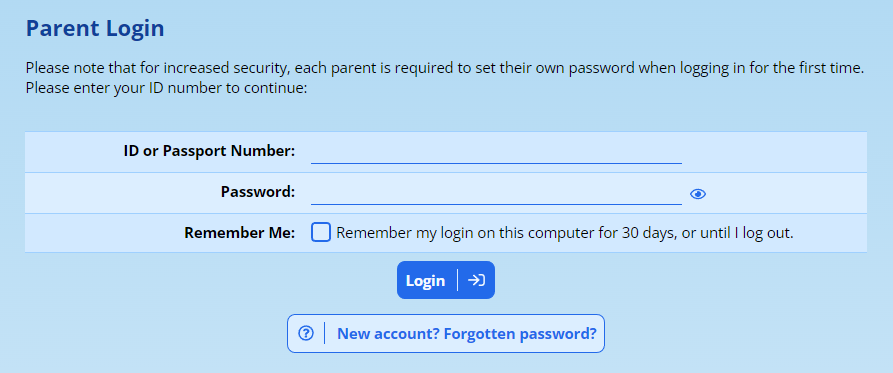When parents attempt to login with an ID number that is duplicated, administrators will receive an email warning them that there is a duplicate ID number on the system. They can then investigate this to find out why. Parents will receive a standard error message saying that their login credentials are invalid.