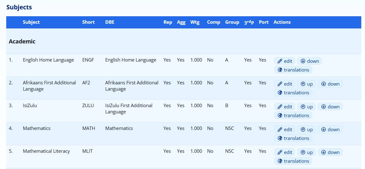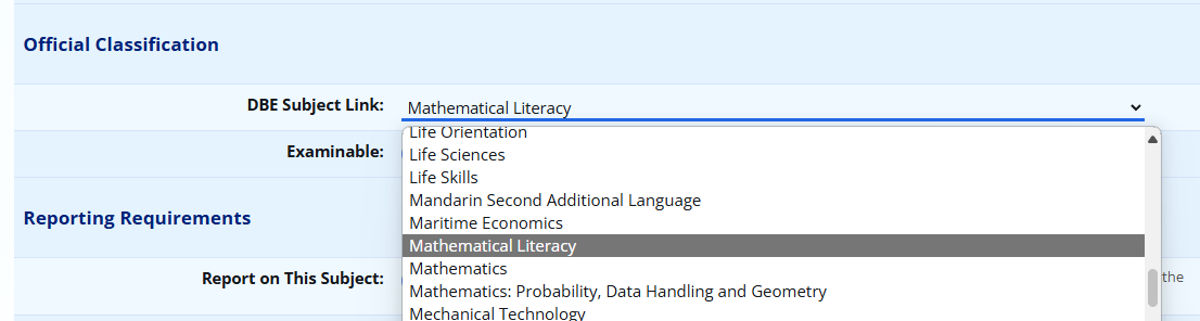 In the example above, notice that Mathematical Literacy, listed fifth in the table, does not have an entry in the DBE column.