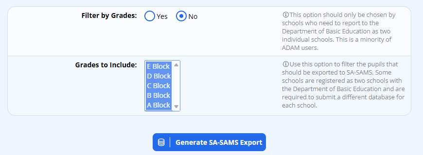 If your school is required to submit more than one application for each of your different phases, please make sure to use the “Filter by Grades” option and choose which grades to include in this export. Note that only teachers who are involved with the pupils in the selected grades will be included in the SA-SAMS export.