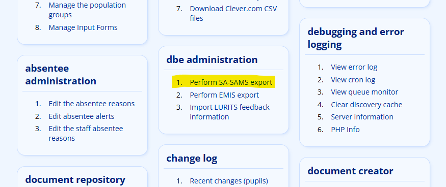 ADAM allows for school data to be exported to an SA-SAMS compatible database. This database can be used for submission to district offices of the provincial departments of education for their reporting purposes.