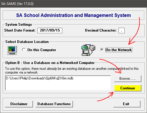 Once installed, look for the “EdusolSAMS” icon in your Start menu. When opening the database, choose the “On the Network” option and then click on the “Browse…” button to find the database you saved: