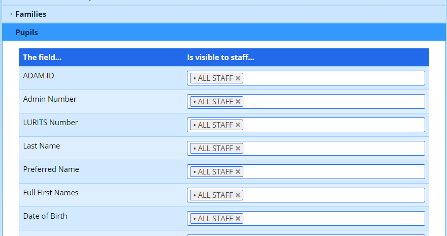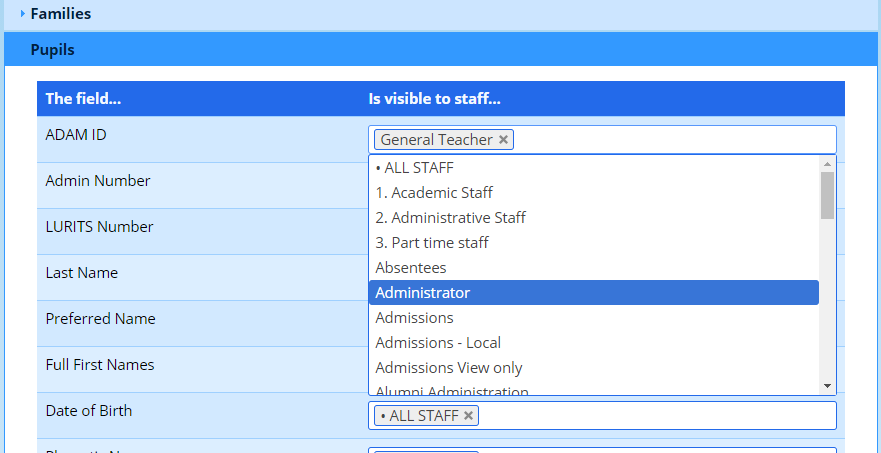 Note carefully that people who have the privileges to add and edit pupils, families or staff will always be able to see all the information on the respective editing screens. However, they may still be restricted from creating scratch lists with that information.