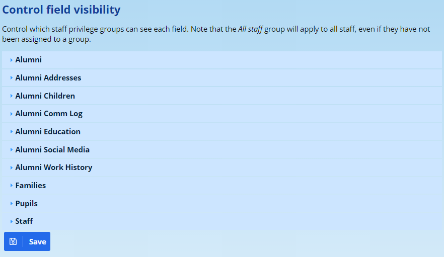 Once you have finished customising the groups that can see each field, click on the Save button at the bottom of the screen.