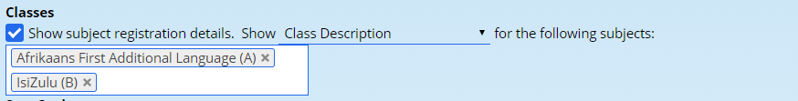 Where a pupil is registered for one of the subjects (say “Afrikaans”) their class details (we’ve chosen “Class Description” above) will appear in the “Afrikaans” column. The Zulu column for that pupil would be empty. The opposite would be true for pupils who take Zulu and not Afrikaans.