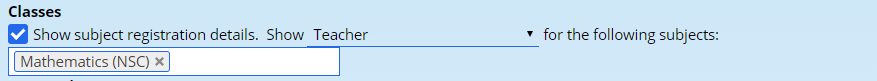 Here you can choose whether ADAM should show information about subject registrations for the pupils in the list. For example, you chould choose to show a list of pupils with their Mathematics teachers by: