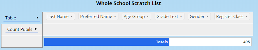 - Because we are looking to summarise information across the whole school, let’s start with a Whole School Scratch List: Pupils → Scratch Lists → Whole School Scratch List.