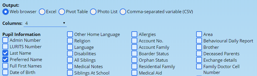 In the screen shot above, you will notice that there is the heading Pupil Information. Some of the fields are ticked and will be ticked when you first get to this screen. If you need any additional information to appear on your list, you can simply tick the field.