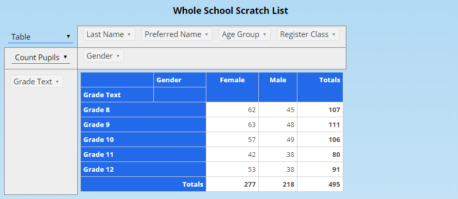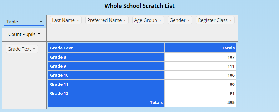 These can be produced by class, by subject, by grade, by age group, by filter or simply choosing everyone in the school.