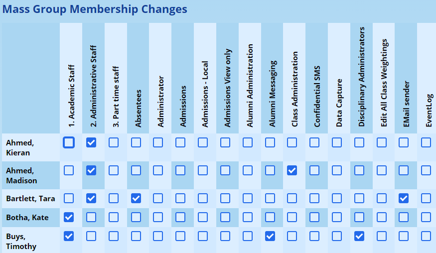 This screen will show all the security groups along the top of the screen, and all the staff members going down. Make any changes and click on Save at the bottom of the screen.