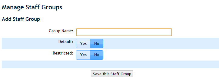 The group name can be anything you like. Enter something that will tell you about what privileges the group assigns. This will help you later when you determine which groups you need to add a staff member to.