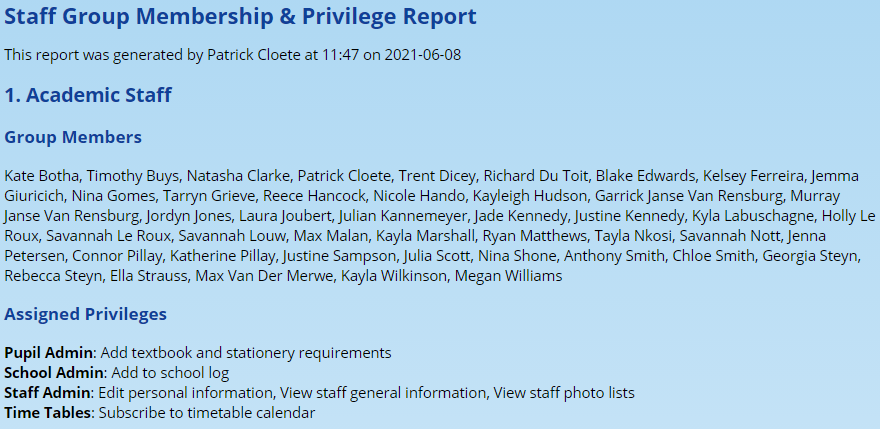 To see which staff members are members of the groups, it can be useful to see this in a single report. This report is possibly easier to deal with when copied and pasted into a spreadsheet which will allow for more custom formatting to make the report easier to read.