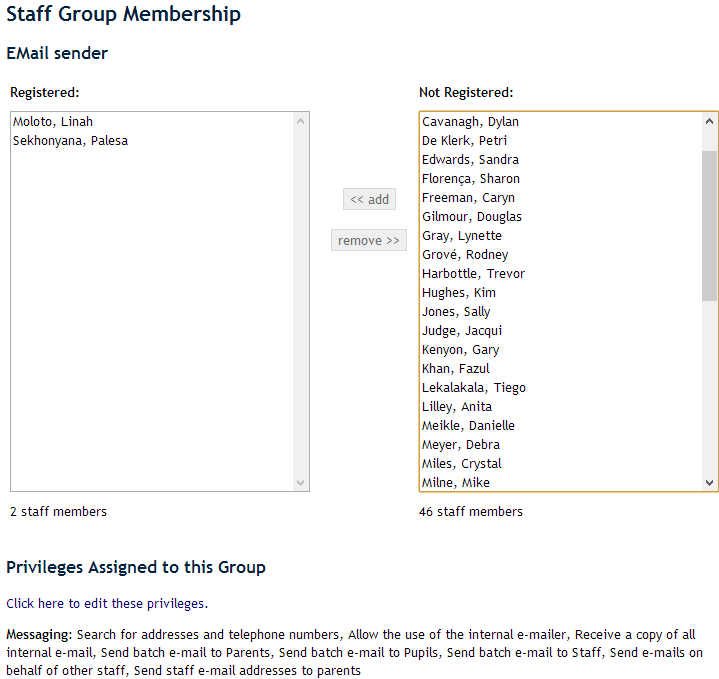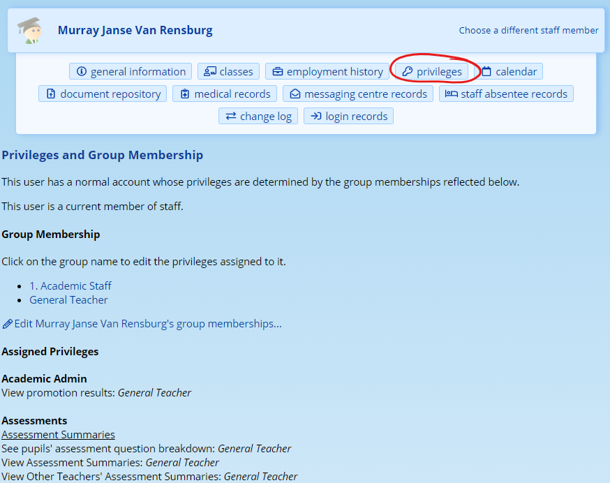 At the bottom is a list of privileges that are available to the teacher because of this. Next to each privilege, in italics is the name of the group, or groups, that have assigned the privilege concerned to the staff member. To remove a privilege from a staff member, then either they need to be removed from the group that is assigning that privilege, or the privilege needs to be removed from the group.