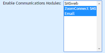 - Under the “Communications” heading, look for the “Enabled Communications Modules” setting. Ensure that ZoomConnect is selected. You may wish to disable SMSWeb, unless you are using both systems. Hold down “Ctrl” to select additional modules and deselect modules.