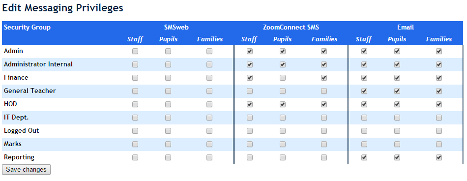 - This page allows you to decide which modules each group is allowed to use and to send to which particular set of users. Ensure that the appropriate groups are given the appropriate privileges under the “ZoomConnect” settings. You may wish to remove any settings from other SMS modules while you are there.