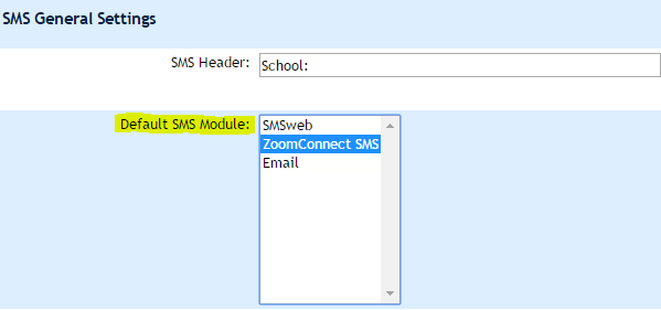 - Find the heading “SMS General Settings” lower down on that page and change the “Default SMS Module” to “ZoomConnect”.