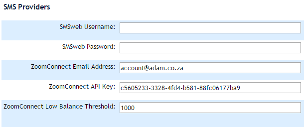 On signing up with SMSweb, they will provide you with a username and password. These details should be entered into the site settings (see Changing Site Settings).
