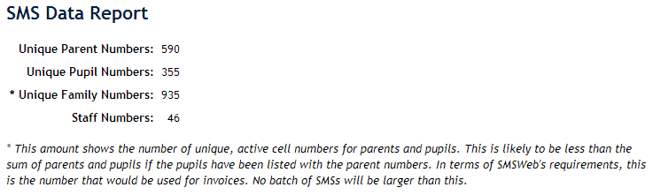 The report lists the total number of unique parent numbers and pupil numbers. Note that where numbers have been duplicated (e.g. mum’s cell number entered as the pupil’s cell number), this will be detected by the system and only one SMS sent per batch. It is for this reason that the parent numbers added to the pupil numbers do not necessarily add up to the “Unique family numbers” total.