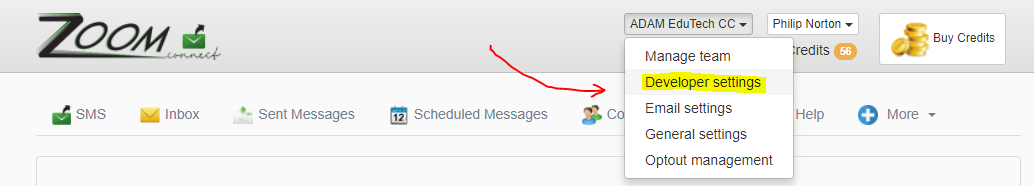 - Click on the “Company Name” at the top right of the screen. A dropdown list will appear. Select the “Developer settings” from this list: