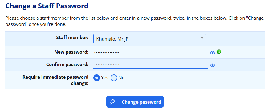 If a user wishes to change their password, they can do so by visiting: Staff → Security Administration → Change your password.