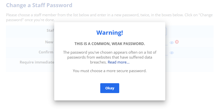 Enter the new password twice into the “Password” fields. You can also decide whether the staff member should be forced to change their password when they next log in. This is recommended!