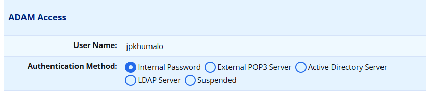 Find the section called “ADAM Access” and make sure that a username is set, and that the Authentication Method is set to “Internal Password”: