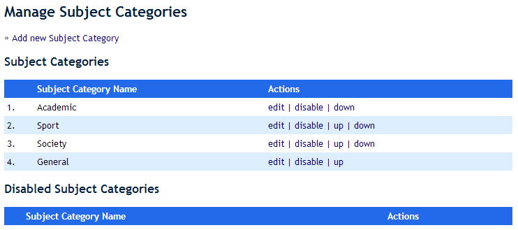 From this screen subject categories can be added, edited, re-ordered and disabled. The order of these categories is largely redundant and for display purposes only. These categories are fully customisable and can be changed to suit your school’s needs.
