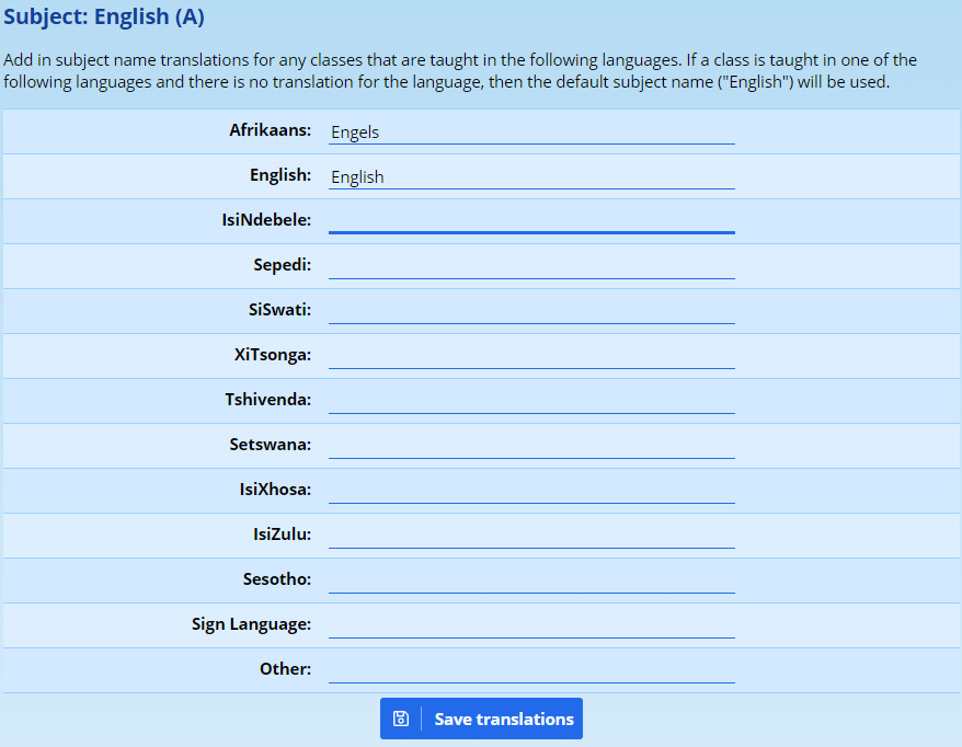 If your school is parallel medium and you wish to have the names on subjects appear on the report in the language of teaching and learning, then you can click on the translations option next to the subject and enter in the translated names for the subject in each of the eleven official languages: