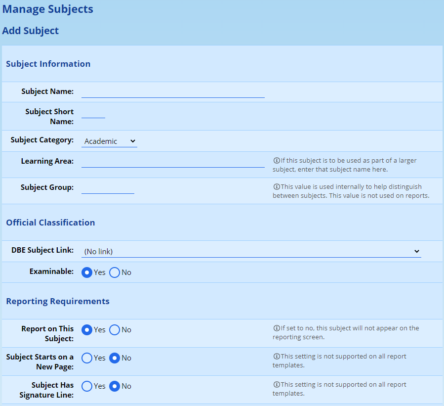 The following information is asked for when adding or editing a subject. A description of what is required is given next to each subject below: