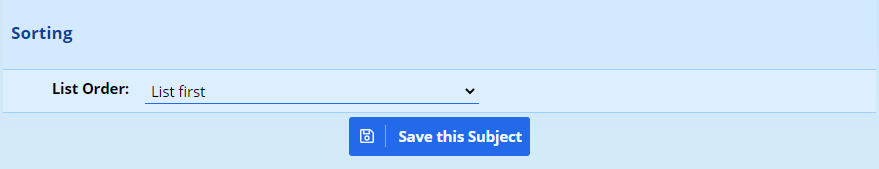 When looking at the list of subjects, as described above, subjects can be moved using the up and down options next to each subject. This is only useful for moving a subject a small number of places. If you need to move the subject more than a few positions, click on the edit option next to the subject and change its sortorder to reflect its desired position in the list: