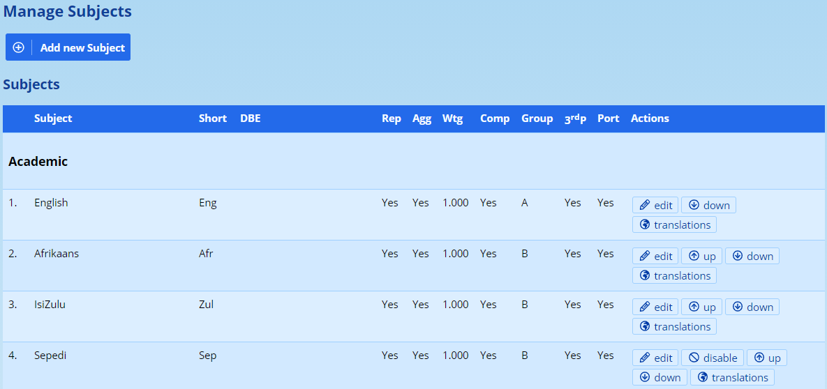 - If an Academic subject is being entered, it may happen that your school wishes to have a slightly different name than is recognised officially by the Department of Basic Education. To avoid confusion, find the official subject in this list. If the subject is non-academic or leads to a non-South African qualification, such as an IGCSE subject, then this can be omitted.