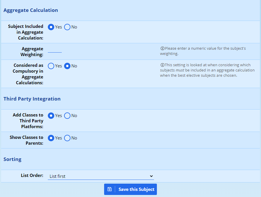 - This setting only applies to Academic subjects. When your aggregate calculation is set to use one of the default options, this subject will be weighted accordingly. Note that if you use a “custom aggregate calculation” (again we will let you know if this is necessary) then this setting is ignored anyway.