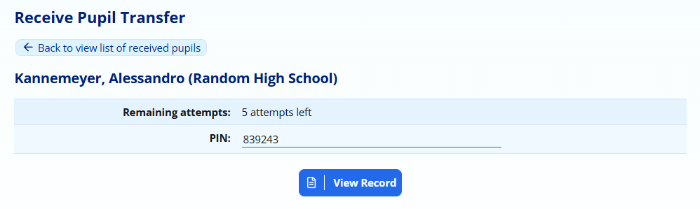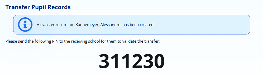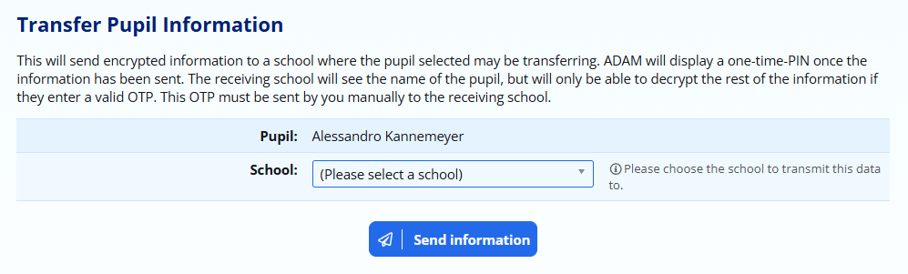 - Information is encrypted before sending with the exception of the first and last names of the pupil and the school that sent the information. Sending schools are provided with a PIN code that must be sent to the receiving school to decrypt the information. Without the PIN, the information cannot be read.