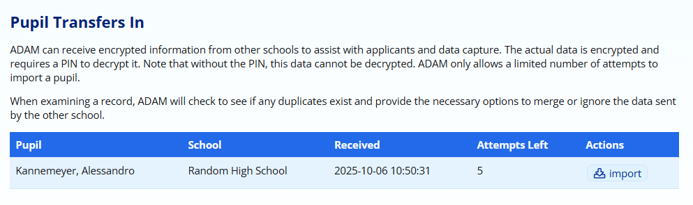 When a pupil’s information is transferred to your server, you will be notified by email (see Initial Setup above). You can also navigate to Admissions → Pupil Administration → Pupil Transfers In.