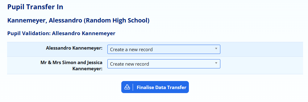 With the correct PIN, ADAM will be able to decode the received information and check to see whether there are any duplicate pupils or families in the database. Assuming there are none, click on Finalise Data Transfer: